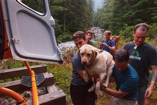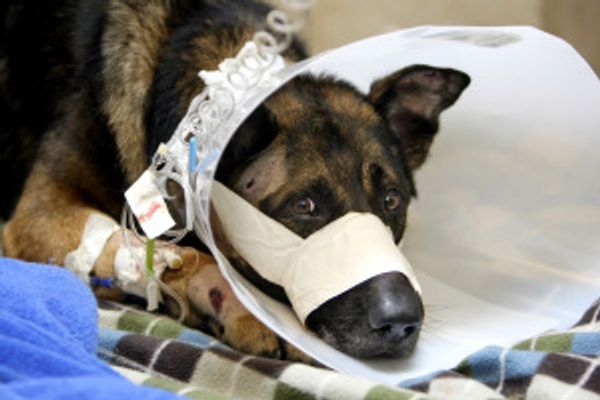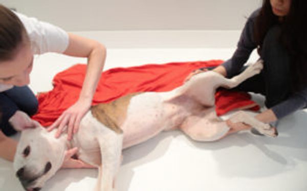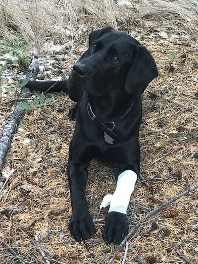 If a dog is injured, handle the dog gently and minimally as you transport it to the vet. If they are still mobile, get them to lay down however they are comfortable and stay, ideally in a carrier or crate. Carry dogs that are significantly injured on a stiff, firm surface, and do everything you can to immobilize whatever parts of the dog's body that may be injured.
