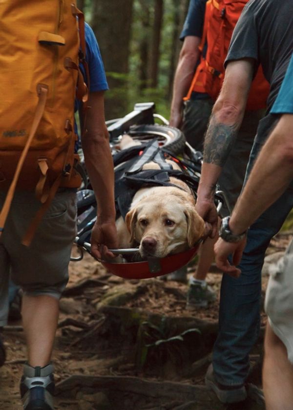 If a dog is injured, handle the dog gently and minimally as you transport it to the vet. If they are still mobile, get them to lay down however they are comfortable and stay, ideally in a carrier or crate. Carry dogs that are significantly injured on a stiff, firm surface, and do everything yo